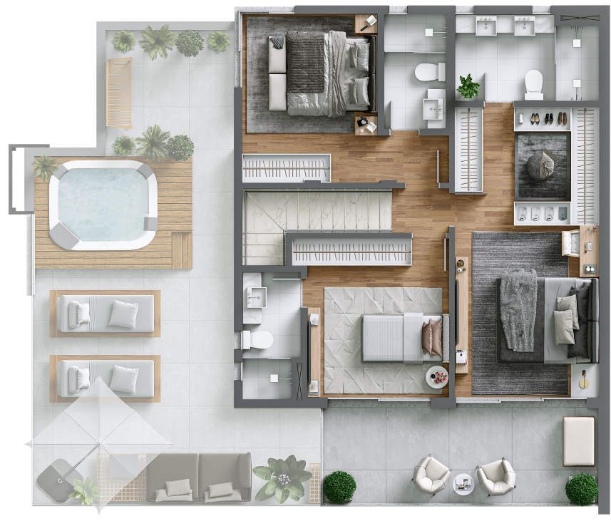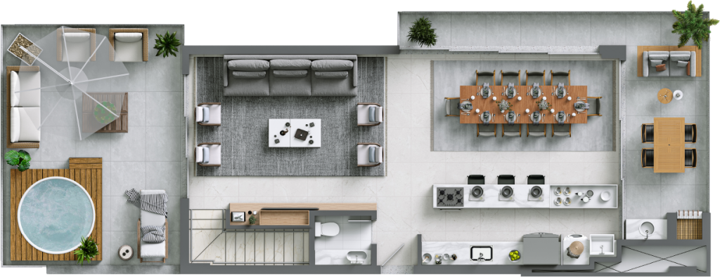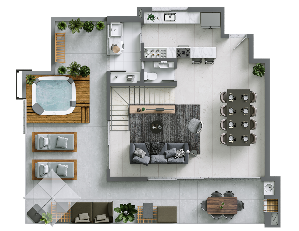 | Amplo terraço com preparação para ofurô ou hidromassagem